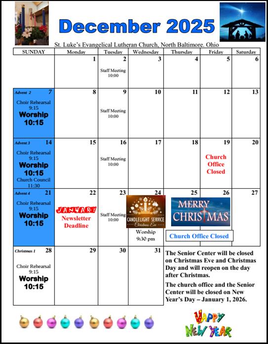 is published at the beginning of each month and is posted online in PDF format with local church information, community events, a current church calendar for the month, and Lutheran news from around the world.